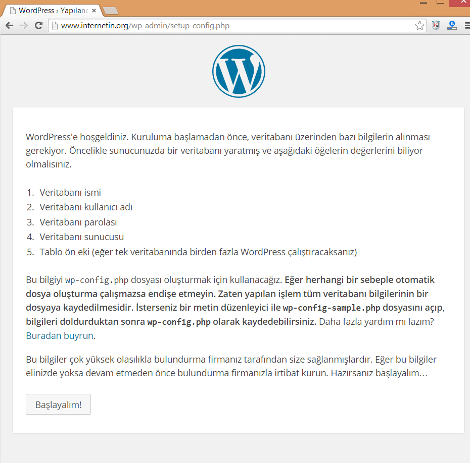 Diyeceksiniz birde nasıl veritabanı oluşturacağımızı göstersen ellerine sağlık, hemen onuda gösterip bi wordpress kuralım internetin.org ‘ a.